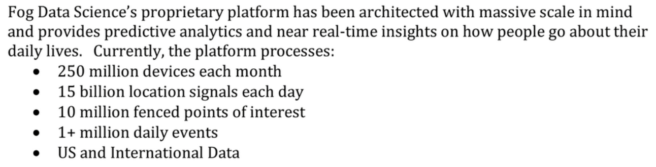 The basics of Fog’s services are laid out in a marketing brochure which was sent to several prospective customers. The brochure explains that Fog’s “unique, proprietary and patented data platform” processes data from “hundreds of millions of mobile devices” and can deliver “both forensic and predictive analytics and near real-time insights on the daily movements of the people identified with those mobile devices[.]” The materials state that Fog’s collection of people’s location data is “100% Opt-in. All users opt-in to location data collection,” though as we will discuss later, this claim is hard to take at face value.