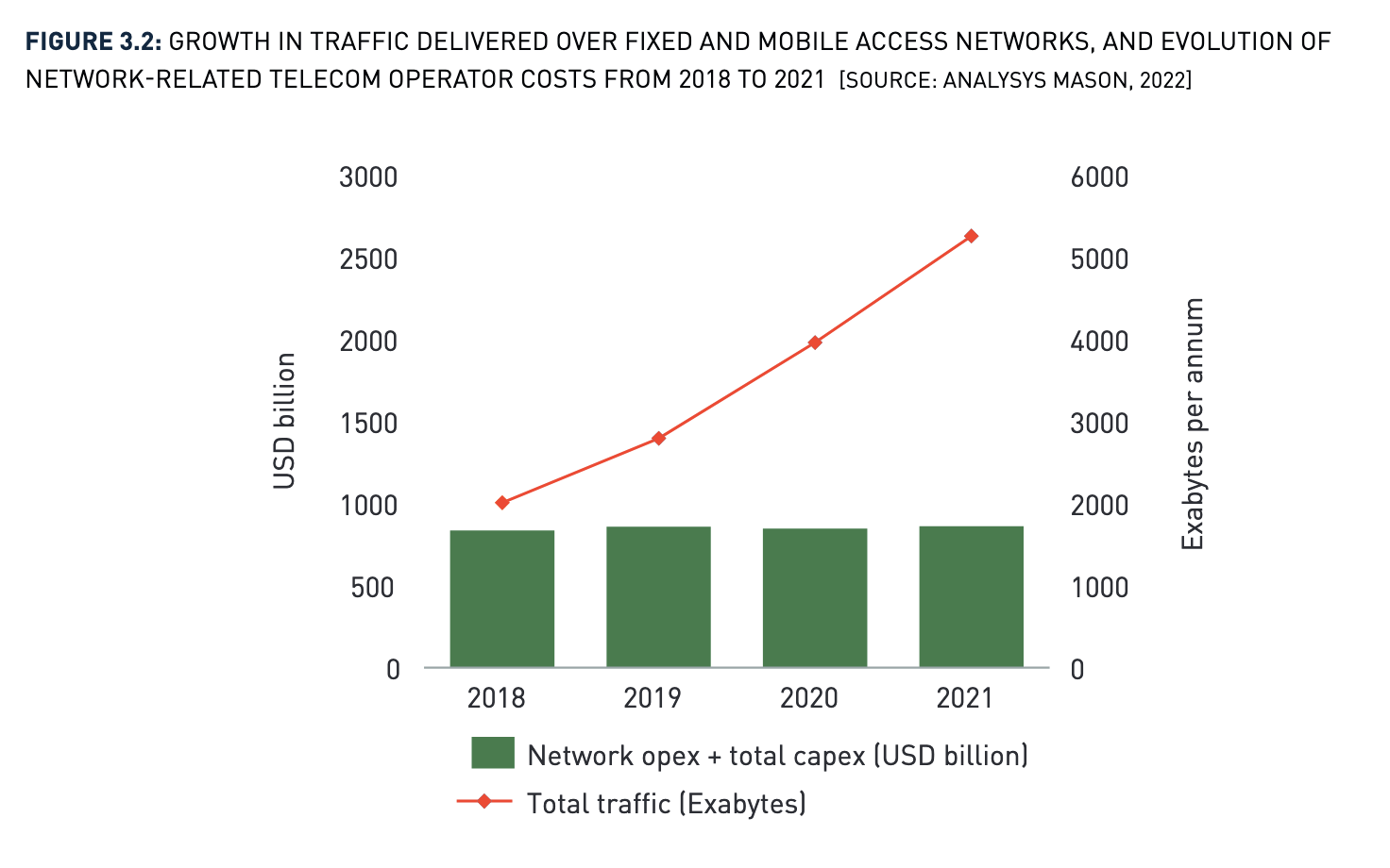 While ISPs are saving from CAPs investments, fundamentally the cost to an ISP for running a network has little to nothing to do with actual traffic going through the networks. In fact, the cost of traffic is only a fraction of an ISPs’ costs. Traffic is not sensitive to costs. One reason is that the networks themselves are built to handle high volumes of traffic. As seen from the chart from Analysys Mason’s report, despite the ever-increasing demand for internet traffic, the cost for global ISPs has essentially been stable.