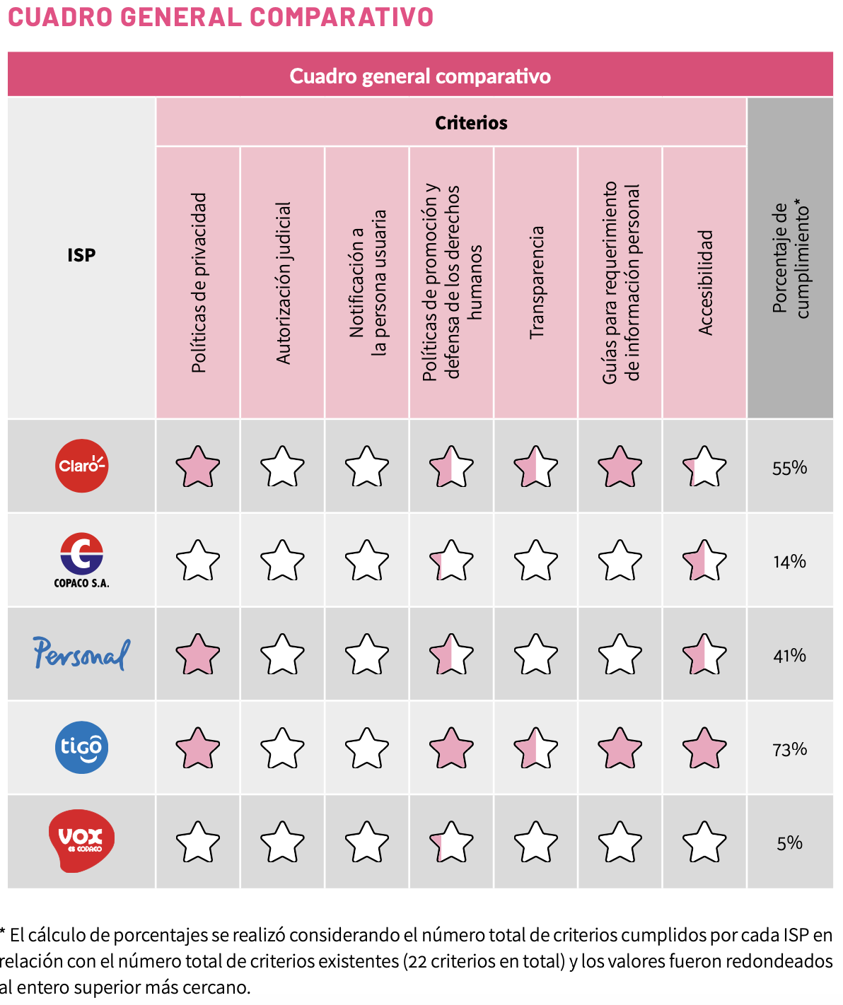 As in its four previous reports about Paraguay, TEDIC evaluated Claro, Personal, and Tigo, which are subsidiaries, and national providers Copaco and Vox.